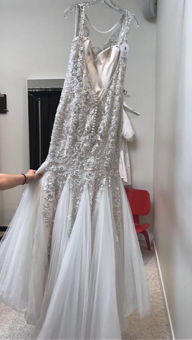 a size 12 (sample size) beautiful dress bought off the rack. It is beaded and has a low cut back. The front is sheer covered, but that can be removed. The dress can be altered to any size.