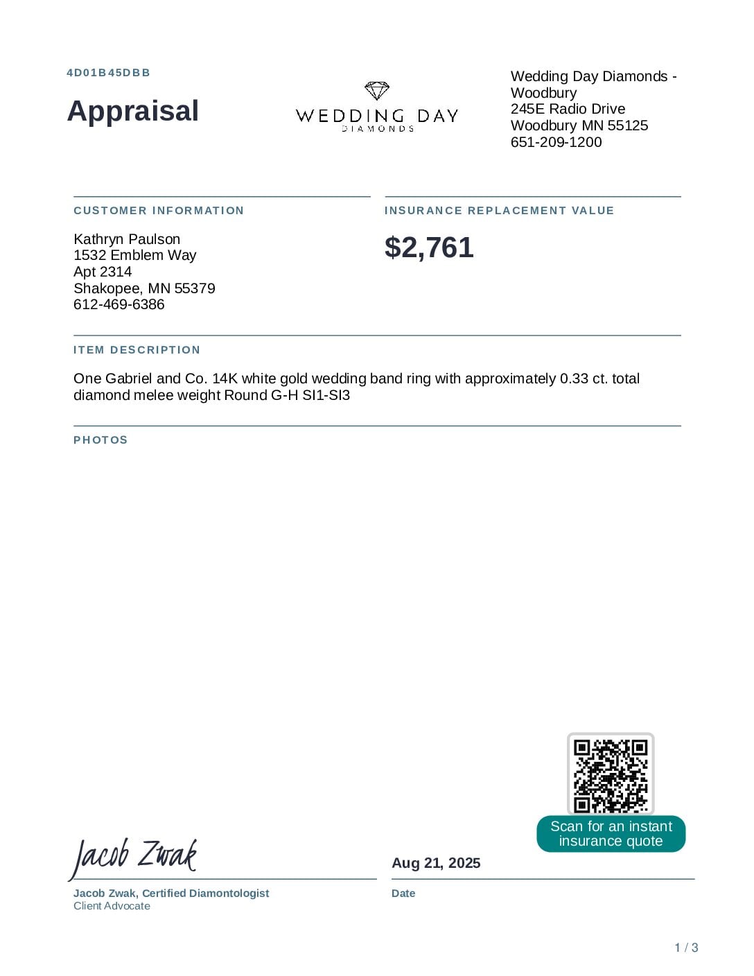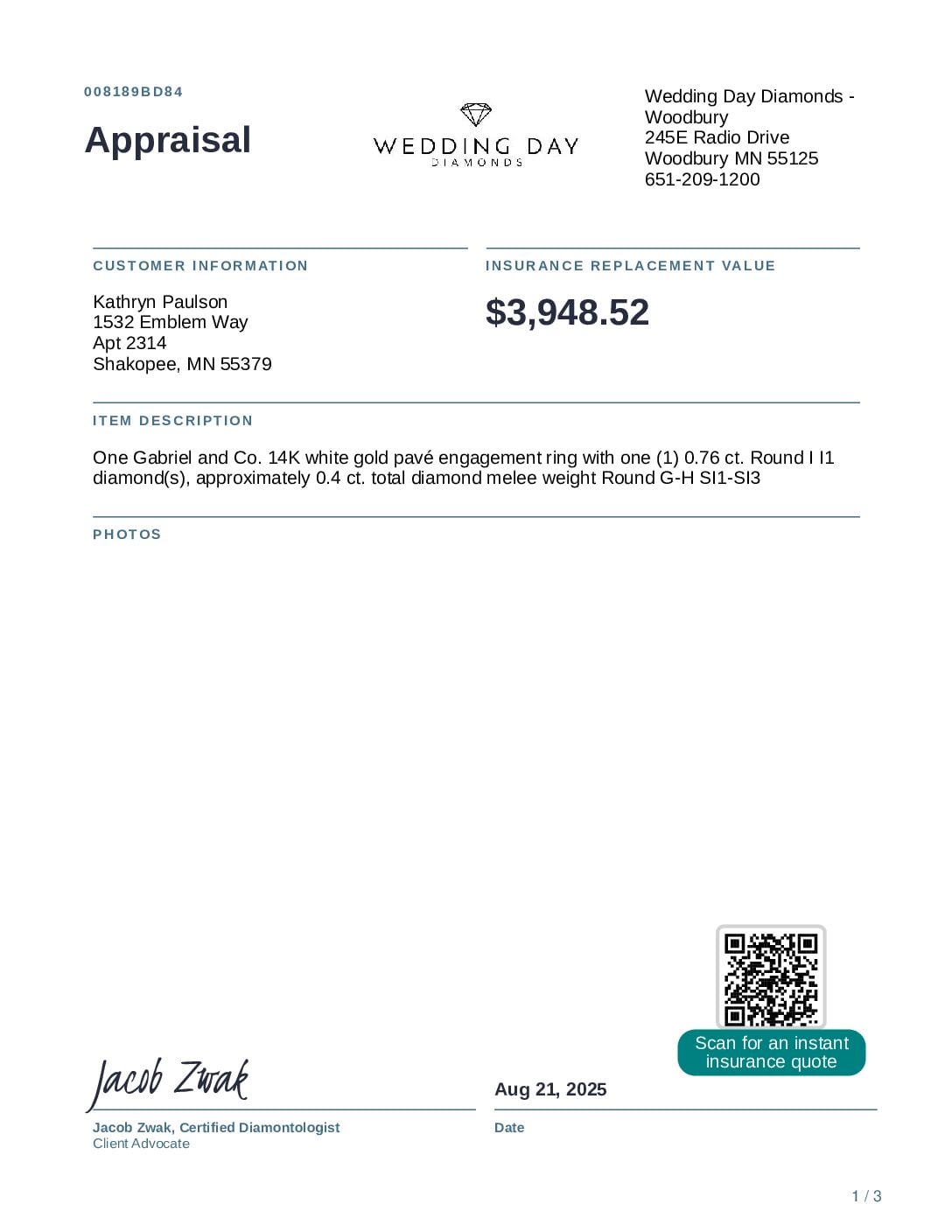 Women’s Gabriel and Co. pavé engagement ring plus one Gabriel and Co. 14K white gold wedding band ring with diamond melee.